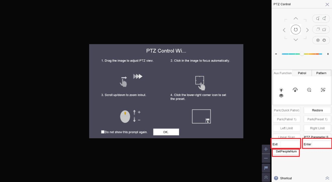 Optional, sistemul permite modificarea manuala a valorilor de persoane din magazin in conditiile in care rezultatele nu sunt precise. Se va naviga pe un canal video care contine o camera IP din grupul de contorizare persoane, click pe butonul PTZ control, iar in partea dreapta a submeniului de control PTZ se vor introduce, de regula, la exit valoarea 0, iar la enter numarul efectiv de persoane din magazin. Aceste date vor fi transmise camerei IP si afisate in OSD-ul acesteia.