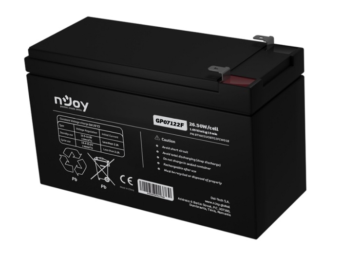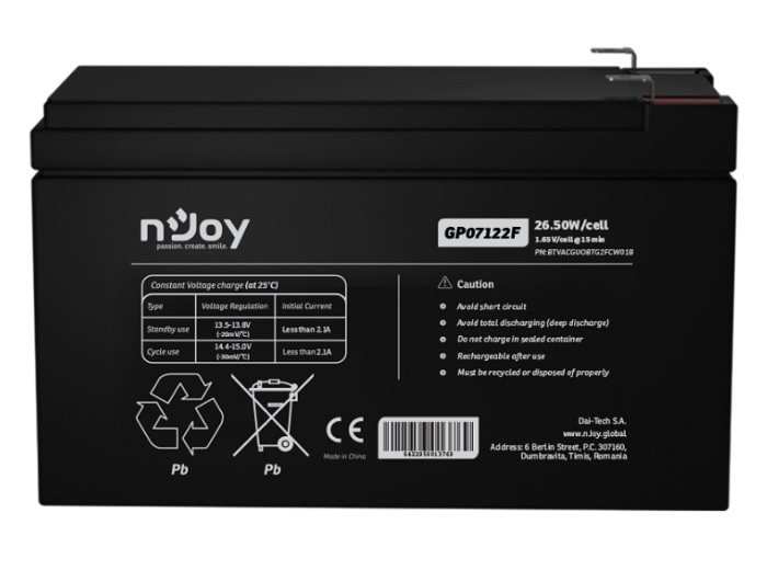 Acumulator UPS, sigilat complet si fara intretinere, incarcare si reincarcare eficiente, autodescarcare minima, tehnologie Pb-acid AGM, terminal F2 (T2) din cupru, tensiune nominala 12V, uz in floating si standby pana la 5 ani, mai mult de 260 de cicluri la 100% DOD, putere (1.65 V / celula @ 15 min) 26.5 W / celula, valva siguranta din cauciuc, carcasa din ABS, dimensiuni 151 x 65 x 94 mm fara terminal (151 x 65 x 100 mm cu terminal), greutate 2 kg