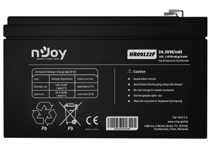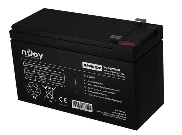 Acumulator UPS, sigilat complet si fara intretinere, suporta descarcari de putere ridicata, incarcare si reincarcare eficienta, autodescarcare limitata, tehnologie Pb-acid AGM, terminal F2 - Faston Tab 250 - din cupru, tensiune nominala 12V, uz in floating si standby pana la 9 ani, mai multe de 260 de cicluri la 100% DOD, putere (1.65 V / celula @ 15 min) 34.30 W / celula, valva siguranta din cauciuc, carcasa din ABS, dimensiuni 151 x 65 x 94 mm fara terminal (151 x 65 x 98 mm cu terminal), greutate 2.68 kg