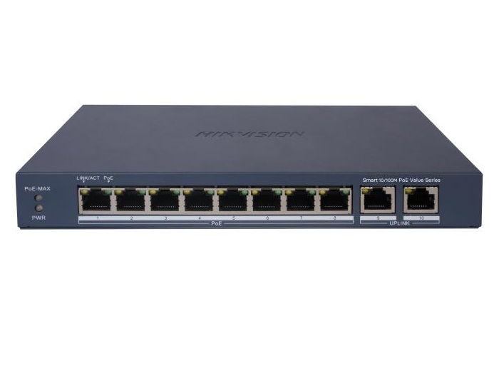 Switch PoE Smart managed, 8 porturi 10/100 Mbps PoE (long-range, pana la 300m distanta transmisie) si 2 porturi Gigabit RJ45, PoE watchdog, loop prevention STP/RSTP, HPP, standarde PoE IEEE 802.3af, IEEE 802.3at, protectie la descarcari electrice pana la 6KV, carcasa metalica, alimentare 54 VDC, Max. 1.2 A