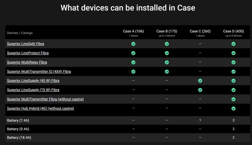 Carcasa alba 106 x 168 x 56 mm pentru dispozitive Ajax (Superior LineSplit Fibra, Superior LineProtect Fibra, Superior MultiRelay Fibra, Superior MultiTransmitter IO (4X4) Fibra), conformitate EN 50131 (Grade 3), EN 60670-1:2005, PD 6662:2017 si INCERT, greutate 186g, temperatura operare –10°С ~ +40°С, umiditate operare max. 75%