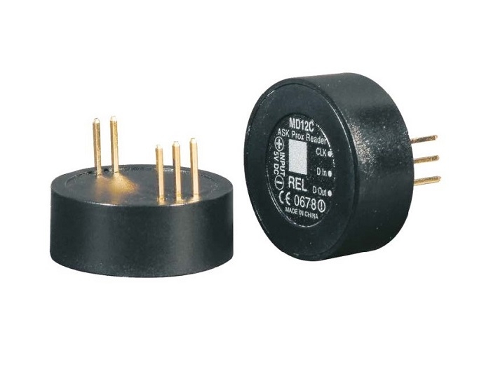Modul cititor de proximitate OEM de dimensiuni mici (diametru de 22mm, raza de 11mm, inaltime de 9.5mm, greutate 5g), montare direct pe PCB-uri, conceput pentru integrarea tehnologiei RFID in aplicatii si produse OEM, format iesire - Clock & Data, modulatie ASK la 125 kHz, distanta citire max. 50mm, alimentare 4.5-5 VDC
