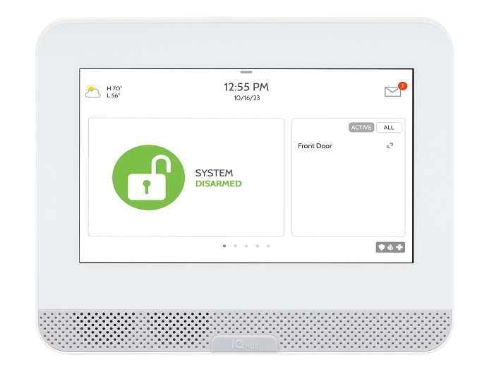 Centrala de alarma IQ 4 HUB, touchscreen LCD de 7" rezolutie 1024 x 600 px, comunicare 4 LTE & WiFi (802.11 a/b/g/n/ac, 2.4/5GHz), Z-Wave Plus (800) - pana la 137 dispozitive, PowerG - pana la 128 dispozitive, dezarmare prin Bluetooth, streaming muzica, 1 microfon, 1 difuzor frontal 4W, sirena 85dB, 128 zone, 4 partitii, pana la 242 coduri utilizatori, sistem de operare Android 9, integrare PowerManage si ConnectAllarm, certificare EN50131 gradul 2, dimensiuni 155 x 191 x 26 mm