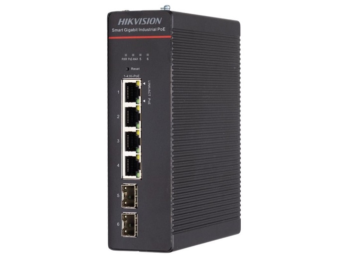 Switch industrial, smart managed, cu 4 porturi gigabit PoE (transmisie long-range - pana la 300m) si 2 porturi gigabit fiber optical, standard PoE IEEE 802.3bt, protectie la descarcari electrice pana la 6KV, PoE watchdog, DHCP snooping, Qos si alte functii, carcasa metalica, IP40, montare pe masa / pe sina, alimentare 48 VDC, 57 A
